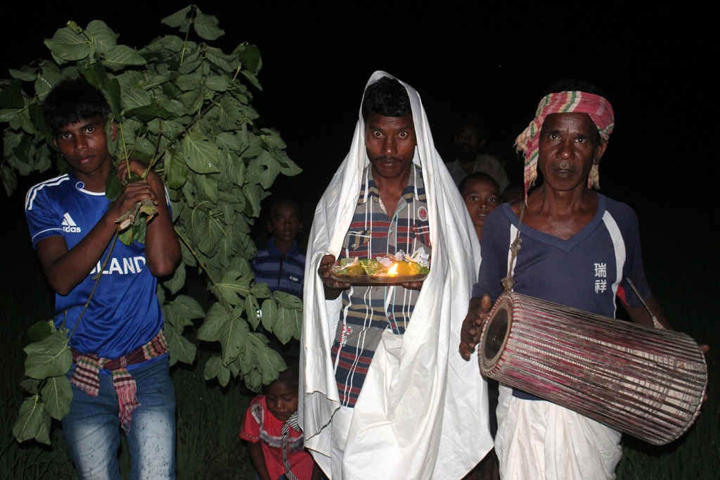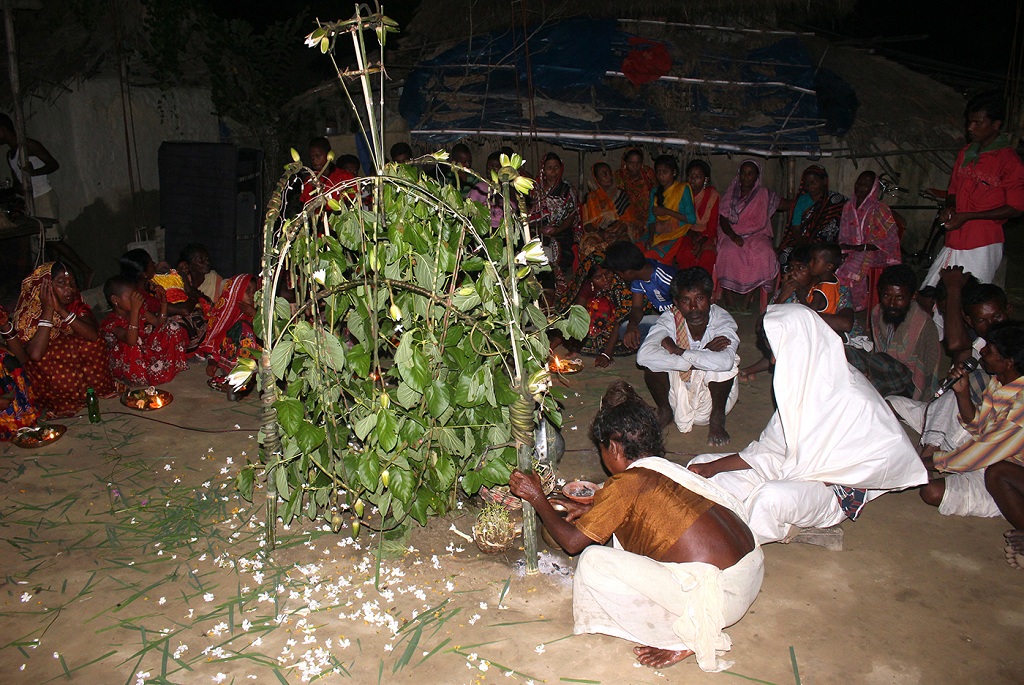 গ্রামটিতে যখন পৌঁছাই, তখন বিকেল হয় হয়। গোত্রপ্রধান বা মাহাতো জগেন কড়ার সঙ্গে আলাপ চলে। খানিক পরই হইচই। এক যুবক পার্শ্ববর্তী ধর্মপুরের গহিন শালবন থেকে কেটে এনেছেন ‘খিল কদম’গাছের একটি ডাল। আমরাও তখন মিশে যাই লোকাচারে।