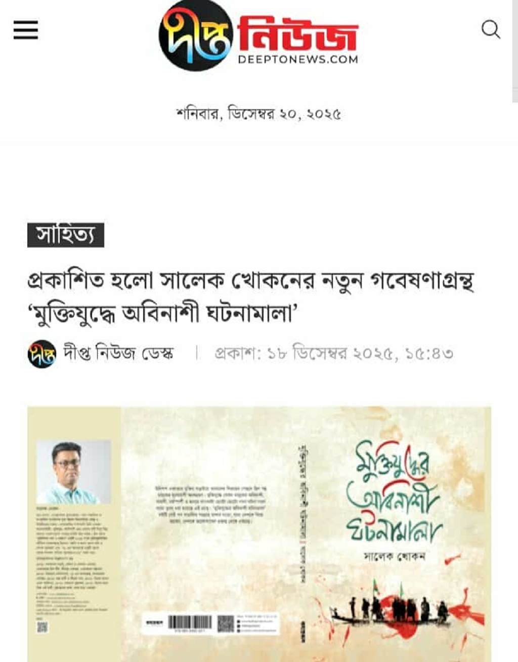 দীপ্ত নিউজ: প্রকাশিত হলো সালেক খোকনের নতুন গবেষণাগ্রন্থ ‘মুক্তিযুদ্ধে অবিনাশী ঘটনামালা’