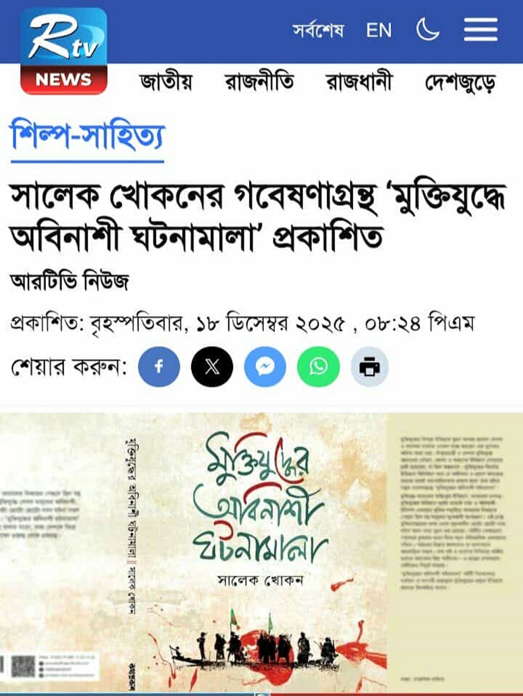 আরটিভি : সালেক খোকনের গবেষণাগ্রন্থ ‘মুক্তিযুদ্ধে অবিনাশী ঘটনামালা’ প্রকাশিত