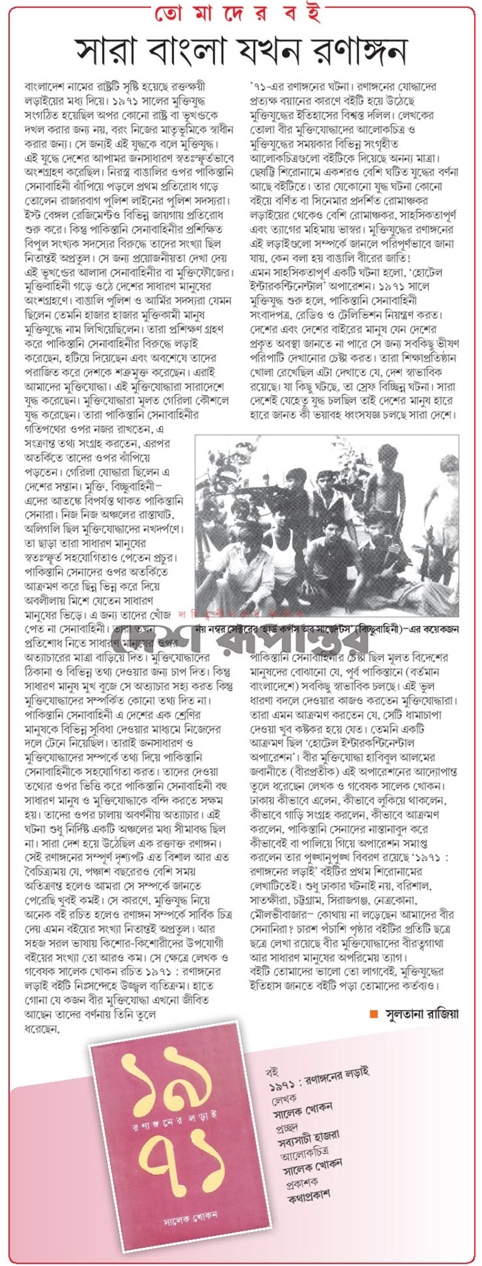 তাদের দেওয়া তথ্যের ওপর ভিত্তি করে পাকিস্তানি সেনাবাহিনী বহু সাধারণ মানুষ ও মুক্তিযোদ্ধাকে বন্দি করতে সক্ষম হয়। তাদের ওপর চালায় অবর্ণনীয় অত্যাচার। এই ঘটনা শুধু নির্দিষ্ট একটি অঞ্চলের মধ্য সীমাবদ্ধ ছিল না। সারা দেশ হয়ে উঠেছিল এক রক্তাক্ত রণাঙ্গন। সেই রণাঙ্গনের সম্পূর্ণ দৃশ্যপট এত বিশাল আর এত বৈচিত্র্যময় যে, পঞ্চাশ বছরেরও বেশি সময় অতিক্রান্ত হলেও আমরা সে সম্পর্কে জানতে পেরেছি খুবই কমই। সে কারণে, মুক্তিযুদ্ধ নিয়ে অনেক বই রচিত হলেও রণাঙ্গন সম্পর্কে সার্বিক চিত্র দেয় এমন বইয়ের সংখ্যা নিতান্তই অপ্রতুল। আর সহজ সরল ভাষায় কিশোর-কিশোরীদের উপযোগী বইয়ের সংখ্যা তো আরও কম। সে ক্ষেত্রে লেখক ও গবেষক সালেক খোকন রচিত ১৯৭১ : রণাঙ্গনের লড়াই বইটি নিঃসন্দেহে উজ্জ্বল ব্যতিক্রম।